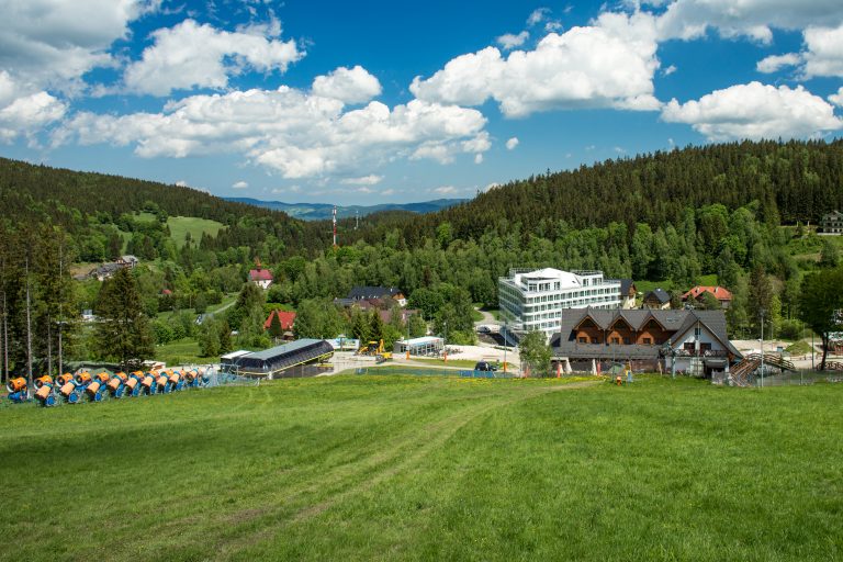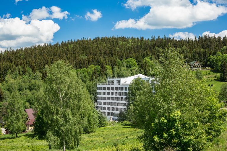 To nowoczesny, całoroczny obiekt położony w samym sercu Czarna Góra Resort, tuż przy dolnej stacji kolei linowej Luxtorpeda. Miejsce to przyciąga swoim niecodziennym wystrojem. Wnętrza są niebanalnie urządzone i niezwykle komfortowe. To doskonała propozycja dla Gości pragnących odpocząć z przyrodą na wyciągnięcie ręki, bo dzięki panoramicznym szybom leżąc w pokoju odnosi się wrażenie, że sudecka natura wchodzi do Twojego apartamentu. W części pokoi znajdują się wanny, w których można wziąć relaksującą kąpiel z widokiem na sudecki krajobraz.