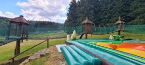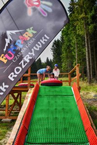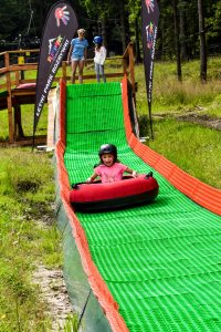 Jedna z najdłuższych, w pełni osiatkowanych tras linowych dla dzieci w Polsce! Aż 19 wieżyczek połączonych różnorodnymi przeszkodami – m.in. grzybki do przechodzenia, tunele, kładki, mini ścianka wspinaczkowa. Dodatkowo długi most wiszący z domkami na słupach, mini park trampolin oraz tubing z wyciągiem taśmowym (100 metrów długości). Na najmłodszych czeka też miękka góra do wspinania i skakania – idealna do bezpiecznej zabawy na świeżym powietrzu.